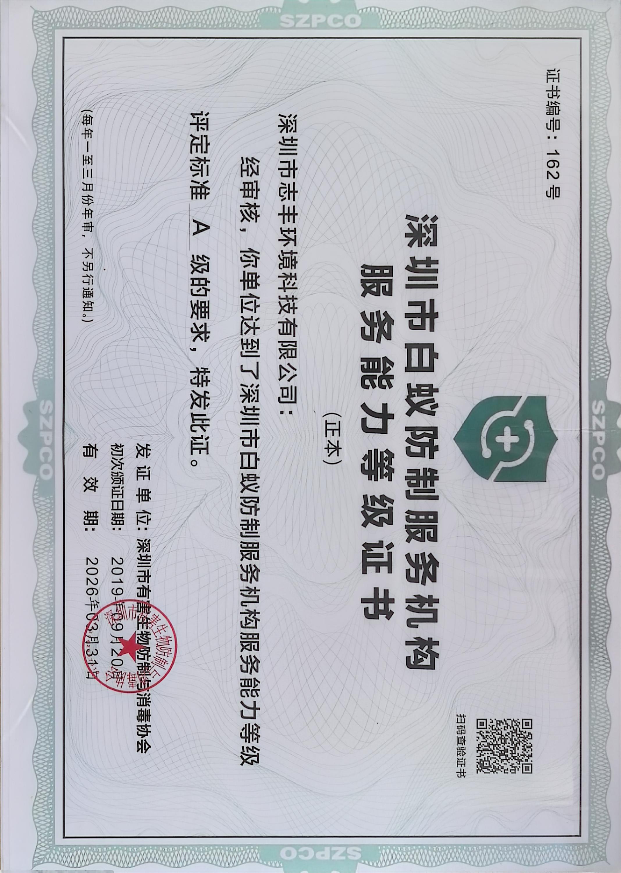 深圳市白蟻防制機構A級服務能力證書